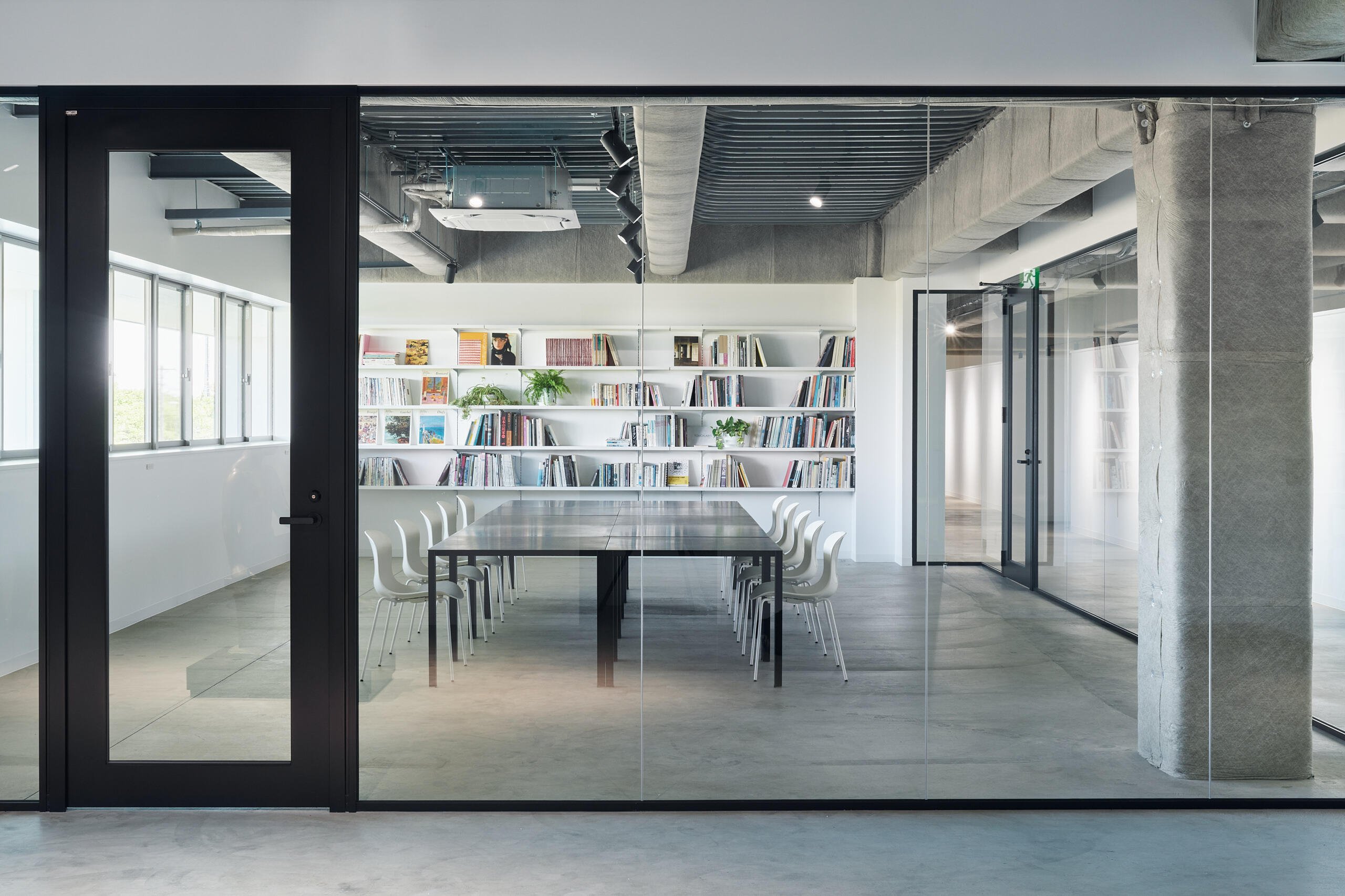 利用する従業員の人数に応じて大きさの異なる会議室を設ける一方、大会議室は廊下に面してガラスパーティションで間仕切ることで、フロア全体を開放的に、そしてギャラリーとして転用したときに一続きの鑑賞空間が生まれるように工夫しました。防音性が求められる会議室を除き、空間全体を壁で間仕切るのではなく、天井まで達しない低い壁でスペースを分けることで、一室空間の中に様々な利用用途を可能にするゾーニングを計画しています。